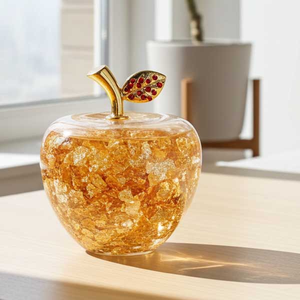 エッセンシャルオイルの中にフェイクゴールドが贅沢に散りばめられている豪華なりんごの置物。金運アップの場合は、西向きに置くのもおすすめです。
