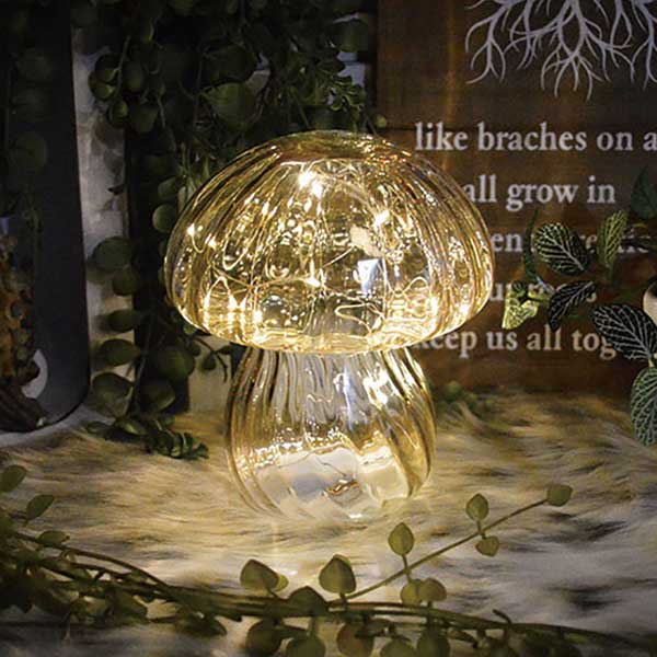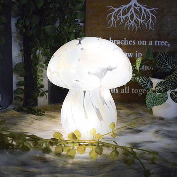 森の中にひっそりと佇む、きのこのかたちをしたガラスのライト。内部のLEDストリングライトからの灯りは、静かに輝きながら空間に幻想的な雰囲気をひろげます。