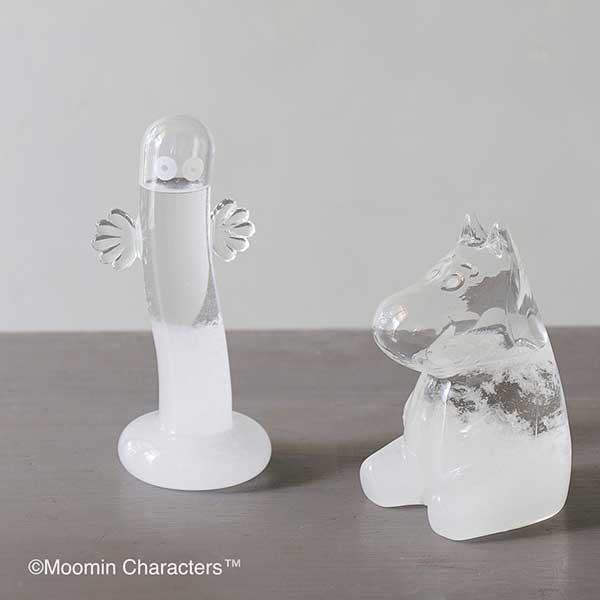 天候によって結晶の様子が変化するストームグラスに、ムーミンでおなじみの「ニョロニョロ」が仲間入りしました。曇りの日には濁った状態、嵐が近づくと大きな結晶が現れるなど、白い結晶の変化を見ることが出来ます。ニョロニョロのシルエットはガラスのオブジェとしてもインテリアを楽しくしてくれます。